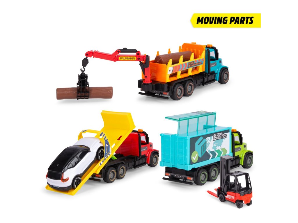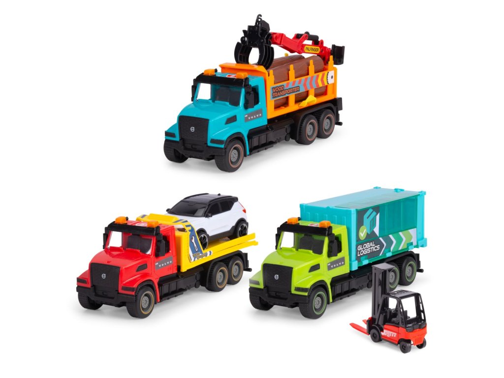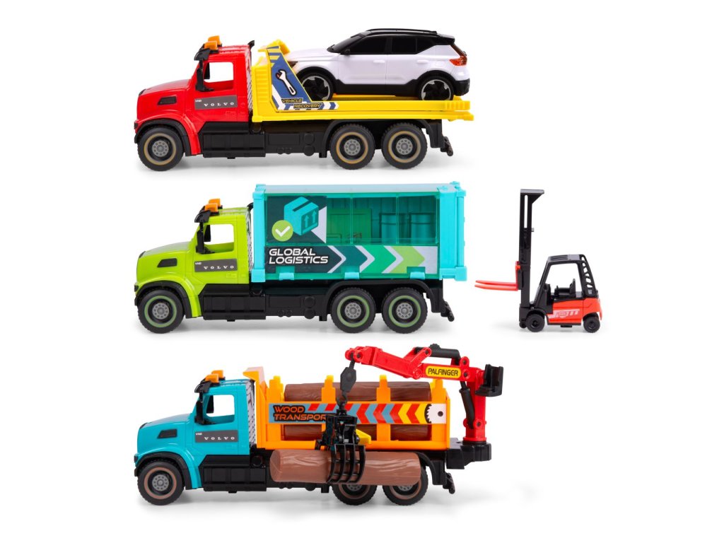 Nákladní auta Volvo VHD 300 na setrvačník, 3 druhy - transportér dřeva, přepravní kontejner s vysokozdvižným vozíkem, odtahový vůz vč. osobního auta. Gumové pnematiky, pohyblivé části a doplňky. Délka 22 cm.