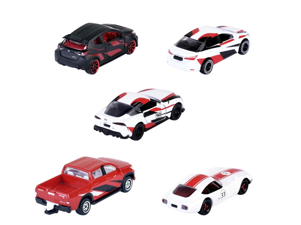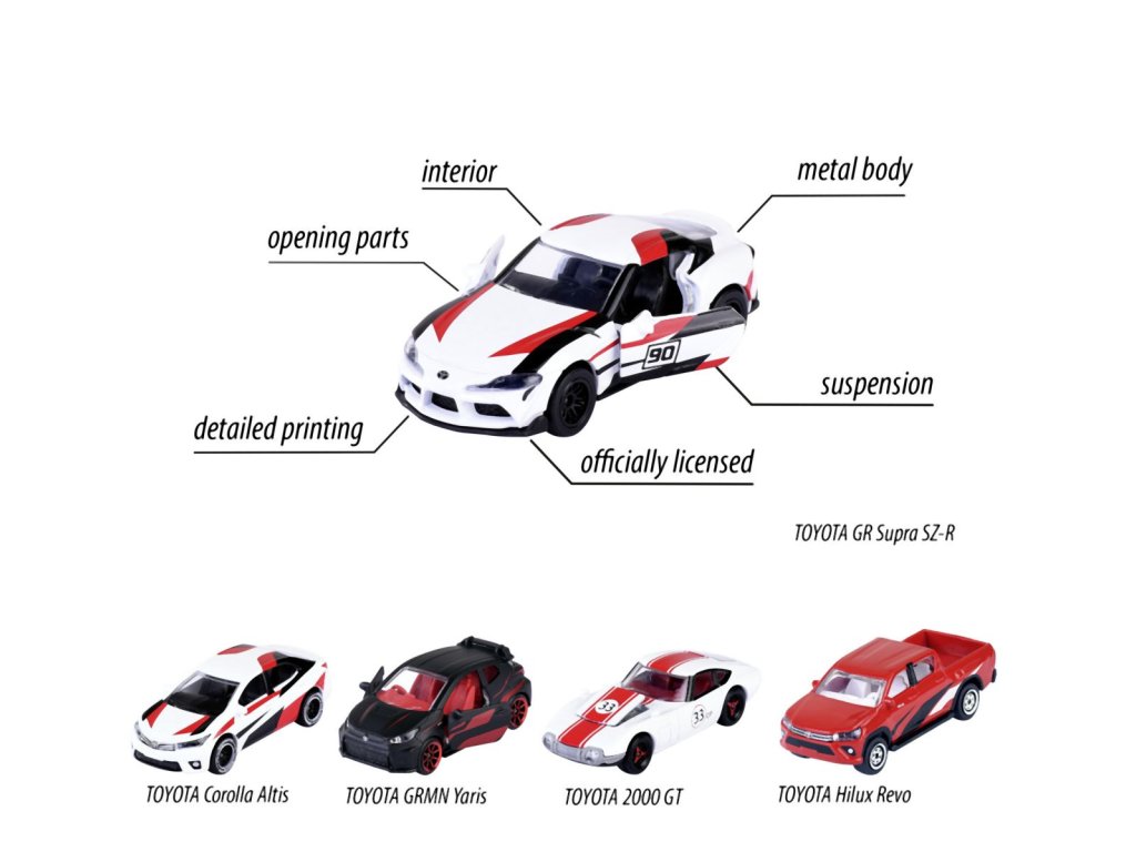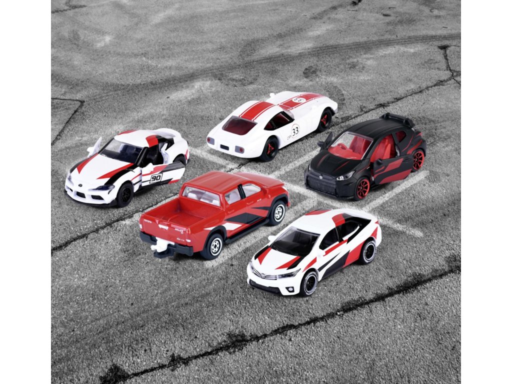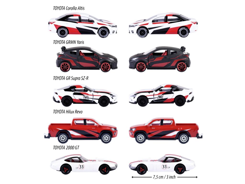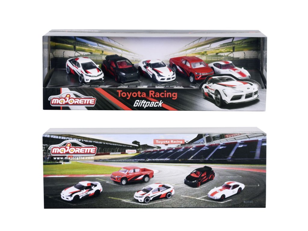 Dárková sada kovových autíček z kolekce Toyota Racing na volnoběh, otevírací části. Balení obsahuje 5 ks: Toyota GR Supra, Toyota GRMN Yaris, Toyota Hilux Revo, Toyota Corolla Altis, Toyota 2000 GT v barvě černé, bílé a červené. Délka autíčka 7,5 cm. V měřítku 1:64.