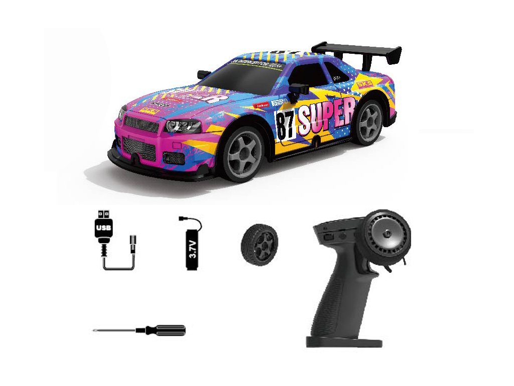Auto 87 Super driftující svítící RC na dálkové ovládání. Rozměry 20x8x6 cm. Frekvence 2.4GHz. Pistolový ovladač. Součástí 4 standardní a 4 driftující kola. Světelné efekty povrchu auta tlačítkem na ovladači. Bateriový pack 3.7V 500mAh lithium do auta součástí, 2xAA do ovladače nejsou součástí. Try Me tlačítko pro světelné efekty v obalu - 3xAG13 baterie (neměnitelné) součástí. Při vybalování nutno odpojit Try Me kabel z auta. USB kabel součástí. Rychlost 12 km/h. Provoz až 20 min, nabíjení 2 h, dosah až 40 m. Přepínač ON/OFF na spodní straně auta a na ovladači.