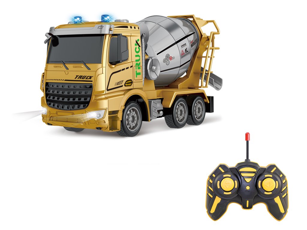 Auto domíchávač RC na dálkové ovládání. Rozměry 24x9x12,5 cm. Frekvence 27MHz. Světelné efekty. Bateriový pack 3.7V do auta součástí, 2xAA do ovladače nejsou součástí. USB kabel součástí. Přepínač ON/OFF na spodní straně auta.