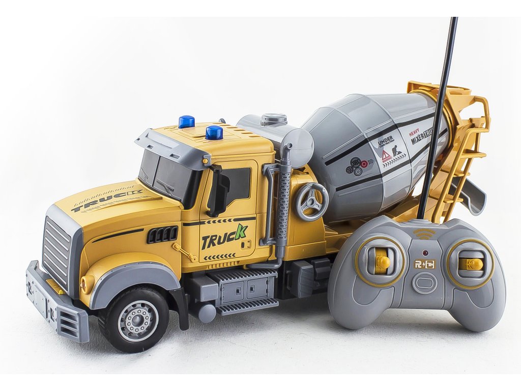 Auto domíchávač. Rozměry 29x9x14,5 cm. Frekvence 27 MHz. Světelné efekty. 3.7V bateriový pack do auta součástí, 2xAA baterie do ovladače nejsou součástí. Přepínač ON/OFF na spodní straně auta. USB kabel součástí.