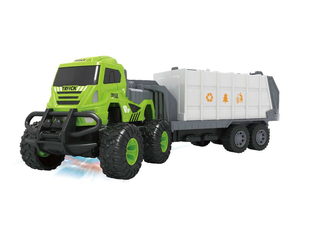 Auto tahač úklidový RC na dálkové ovládání. Rozměry 35x11x12 cm. Světelné efekty. 3xAA baterie do auta, 2xAA do ovladače nejsou součástí.