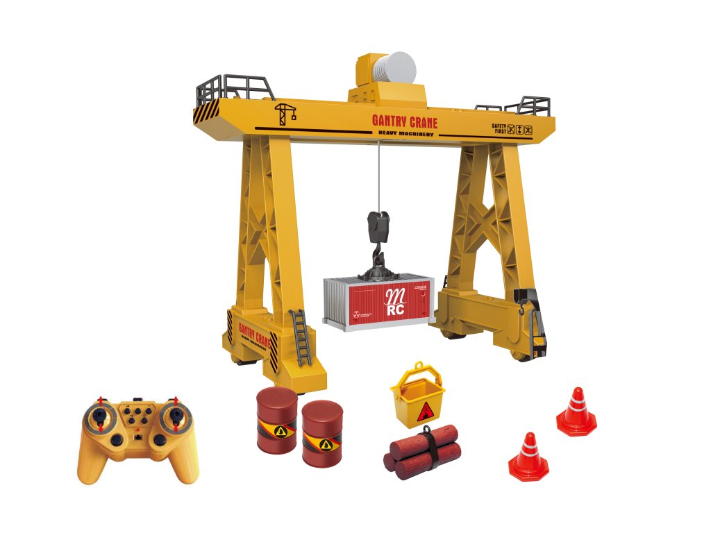 Jeřáb portálový RC na dálkové ovládání. Rozměry 33x17x27 cm. Součástí jeřáb, nabírací nádoba, kontejner, 2 barely, 2 klády, 2 kužely. Frekvence 2.4GHz. Světelné a zvukové efekty. Ovladač - pohyb dopředu, dozadu, otáčení na místě, levé velké tlačítko - zvedání nákladu, pravé velké tlačítko - pokládání nákladu, 5 malých tlačítek - klakson, světlo, zvukové efekty, startování, demo režim. 3.7V bateriový pack do jeřábu součástí, 2xAA do ovladače nejsou součástí. USB kabel součástí. Přepínač ON/OFF jeřábu a na ovladači.