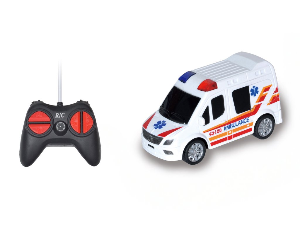 Sanitka RC na dálkové ovládání. Rozměry 13,5x5,5x7 cm. Frekvence 27MHz. Světelné efekty. 2xAA do auta, 2xAA do ovladače nejsou součástí. Přepínač ON/OFF na spodní straně auta.