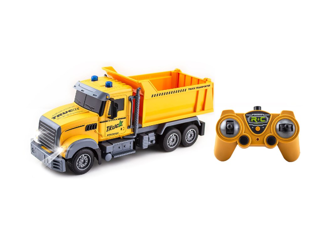 Sklápěč RC na dálkové ovládání. Rozměry 29x9x12,5 cm. Frekvence 2.4GHz. Světelné a zvukové efekty. 3.7V bateriový pack do sklápěče součástí, 2xAA baterie do ovladače nejsou součástí. USB kabel součástí.