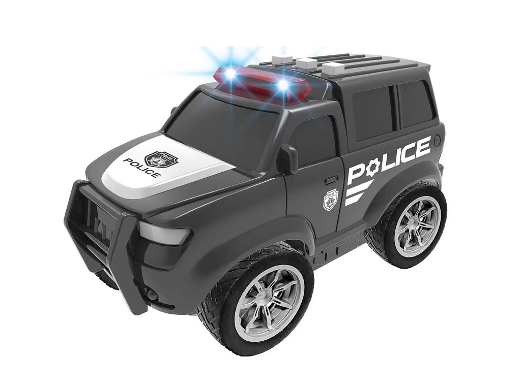 Auto policejní, na setrvačník, s efekty, černé. Rozměry 22,5x11,5x14 cm. Vydává světelné a zvukové efekty. Baterie 3xAG13, součástí balení.
