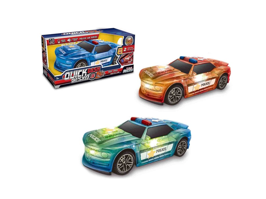 Auto policejní. Světelné a zvukové efekty tlačítky na střeše auta. 3xAA baterie součástí. Přepínač zvuku na spodní straně auta. 2 varianty - červená, modrá.