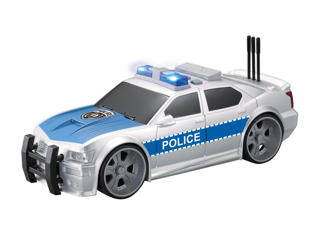 Auto policie s efekty na setrvačník. S otevírací kapotou, otevírá se tlačítkem na střeše auta. Rozměry 27,2x9,1x11 cm. Vydává světelné a zvukové efekty, aktivace tlačítky na střeše (zvuk motoru, couvání, troubení, maják). Baterie 3xAG13, součástí balení.