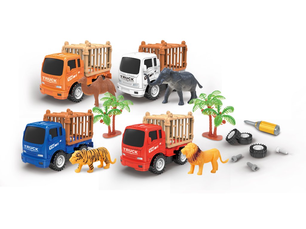 Auto safari šroubovací. Rozměry 16x10x6,5 cm. Součástí auto, šroubovák, 2 koncovky šroubováku, 2 figurky zvířátek, strom. Na setrvačník. 4 barevné varianty.