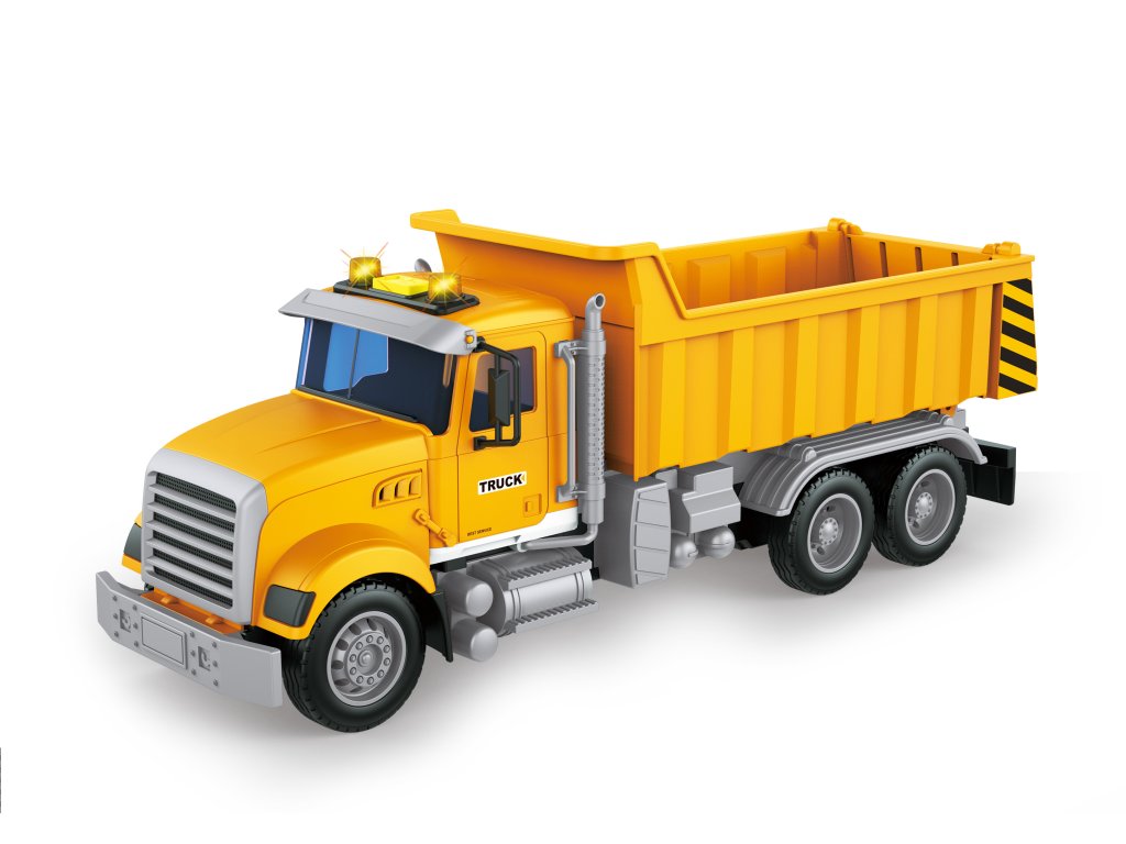 Auto sklápěč s efekty. Rozměry 31x9,5x11 cm. Na setrvačník. Světelné a zvukové efekty tlačítkem na kabině. 3xAG13 baterie do střechy součástí. Sklopná nakládací plocha uvolněním pojistného tlačítka na boční straně pod nakládací plochou. Otevíratelná zadní část nakládací plochy.
