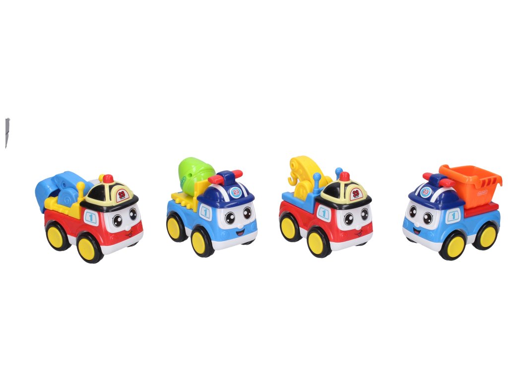 Auto stavební s obličejem. Rozměry auta 10,5 x 6,5 x 9 cm. Display box - 10 ks. Na setrvačník. 4 varianty - bagr, jeřáb, míchačka, sklápěč.