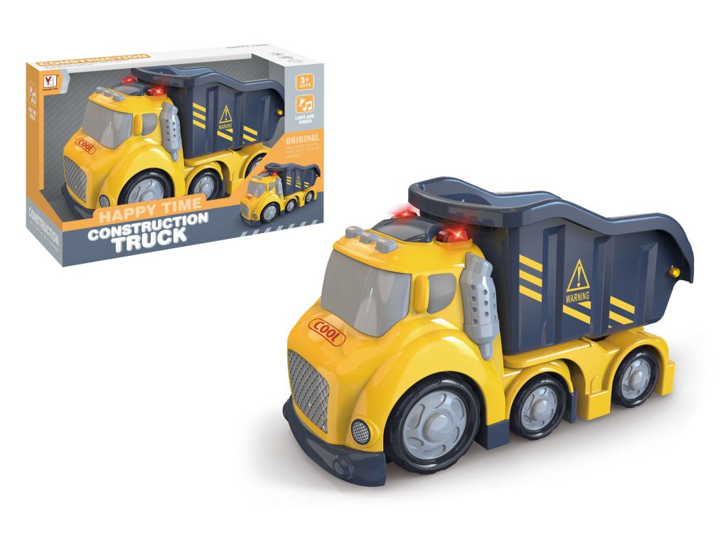 Auto stavební sklápěč. Vydává světelné a zvukové efekty. Baterie 3xAG13, součástí balení. Aktivace tlačítky na střeše (zvuk startování, zvuk troubení, zvuk couvání). Volná kola.