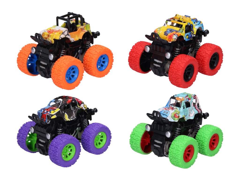 Auto terénní na setrvačník s graffiti. Rozměry auta 8x9x8,5 cm. Display box 8 ks. Více variant.