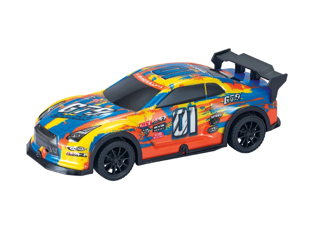 Auto závodní s efekty. Rozměry 19,5x8,5x5,5 cm. Na setrvačník. Světelné a zvukové efekty stiskem přední kapoty. 4xAG13 baterie součástí.