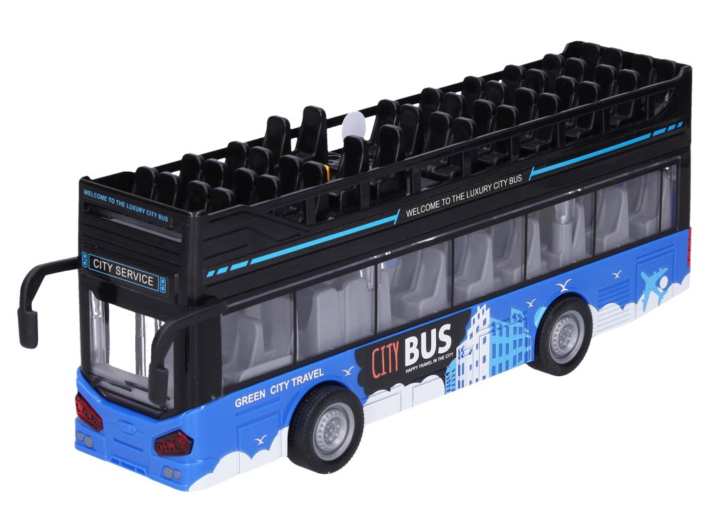 Autobus dvoupatrový vyhlídkový s efekty. Rozměry 28,5x6,5x12 cm. Na setrvačník. Světelné a zvukové efekty tlačítky na střeše. 3xAG13 baterie součástí. Otevírací dveře kolečky nad okny.