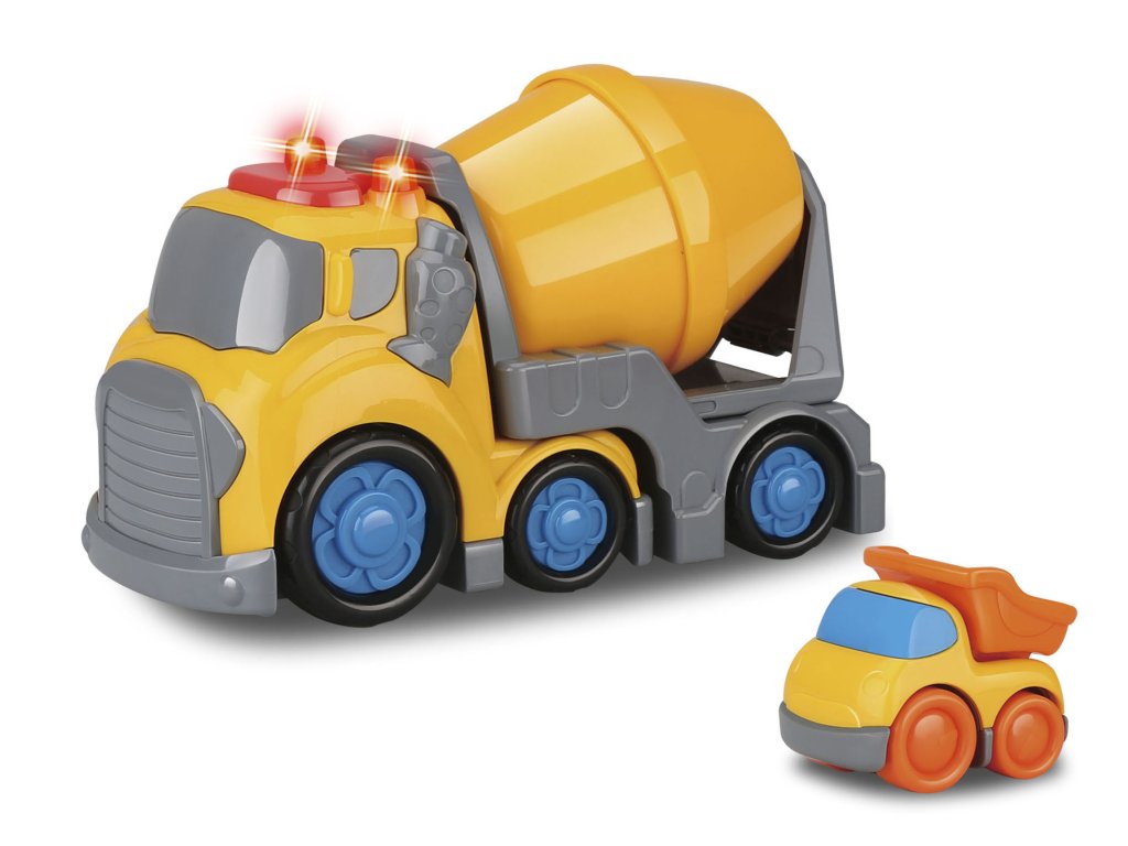 Balení obsahuje auto míchačku s efekty 19,5 cm a malé sklápěcí auto 6,5 cm.