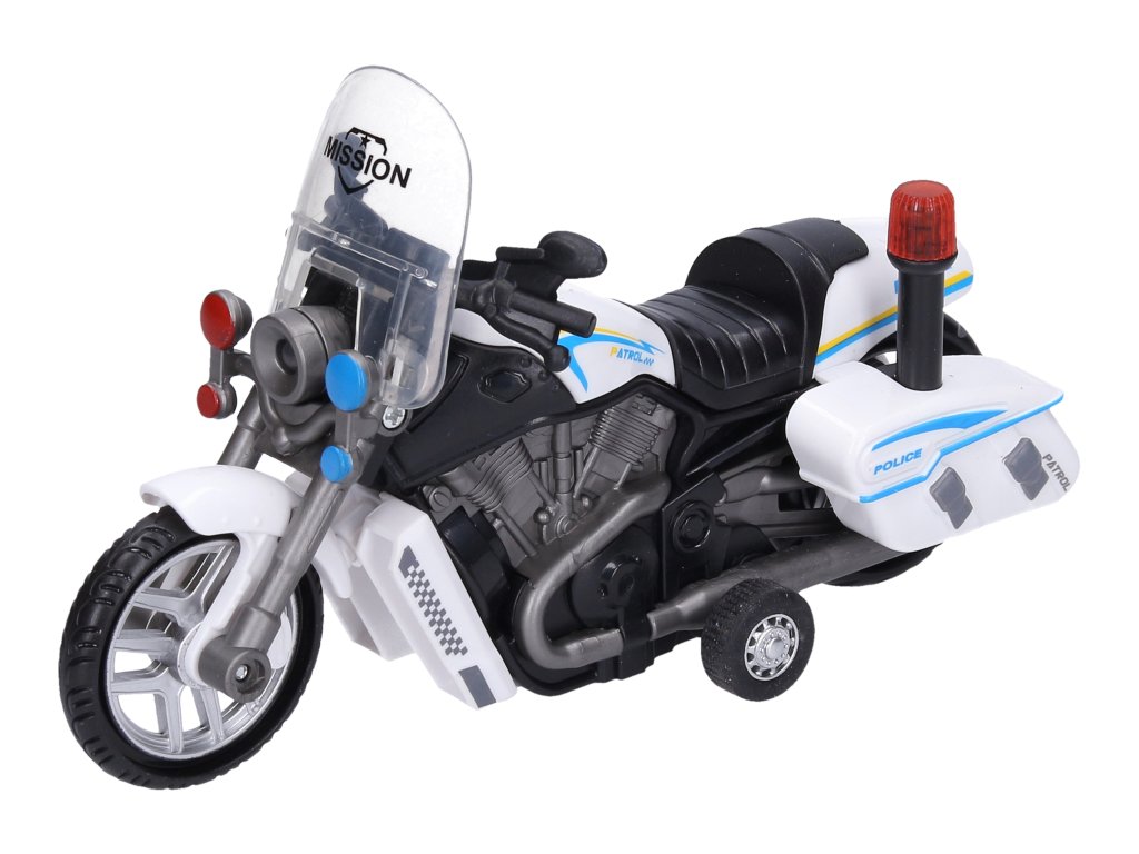 Motorka policie na setrvačník s efekty 16 cm. Rozměry 16,2x6,1x9,6 cm. Display box 8 ks. Vydává světelné a zvukové efekty. 3xAG10 baterie součástí.