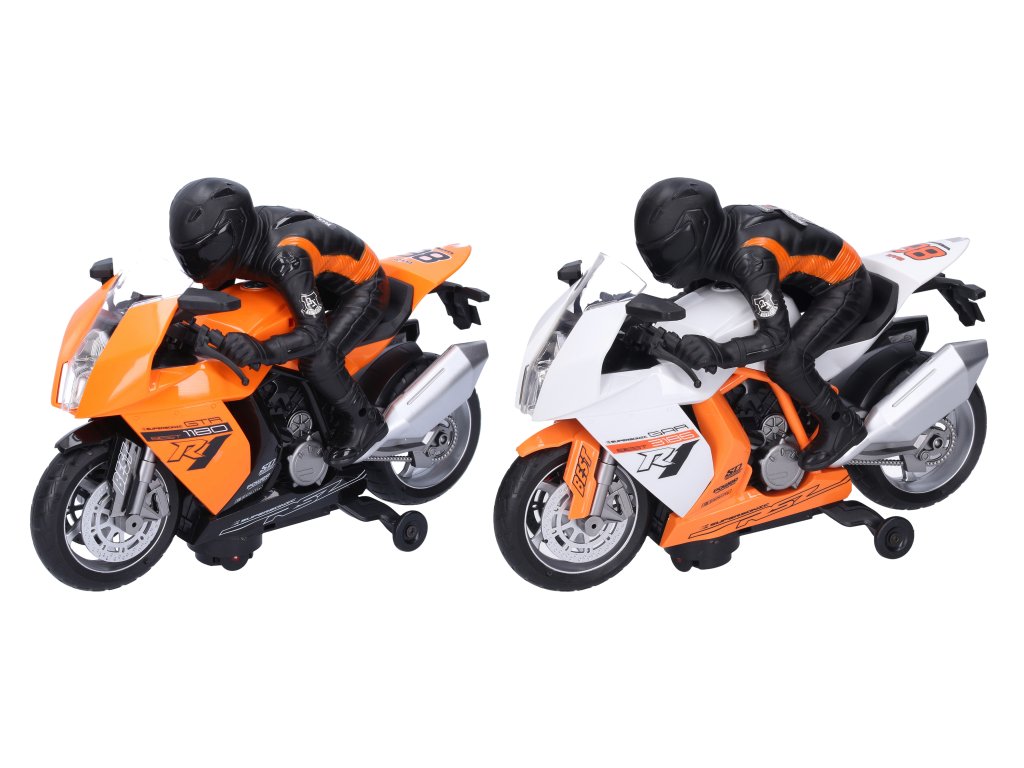 Závodní motorka s figurkou jezdce. Velikost 28 cm. Světelné a zvukové efekty. 4xAA baterie nejsou součástí. 2 varianty - oranžová, bílá.