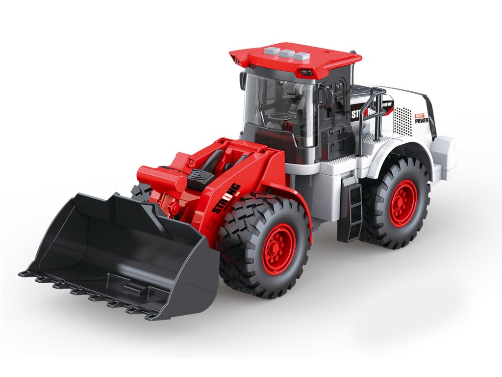 Nakladač s efekty na setrvačník. Velikost 30 cm. Vydává světelné a zvukové efekty. Aktivace tlačítky na střeše. Zvuky couvání, troubení, startování motoru, pohyby nakladače. 3xAG13 baterie, součástí balení.
