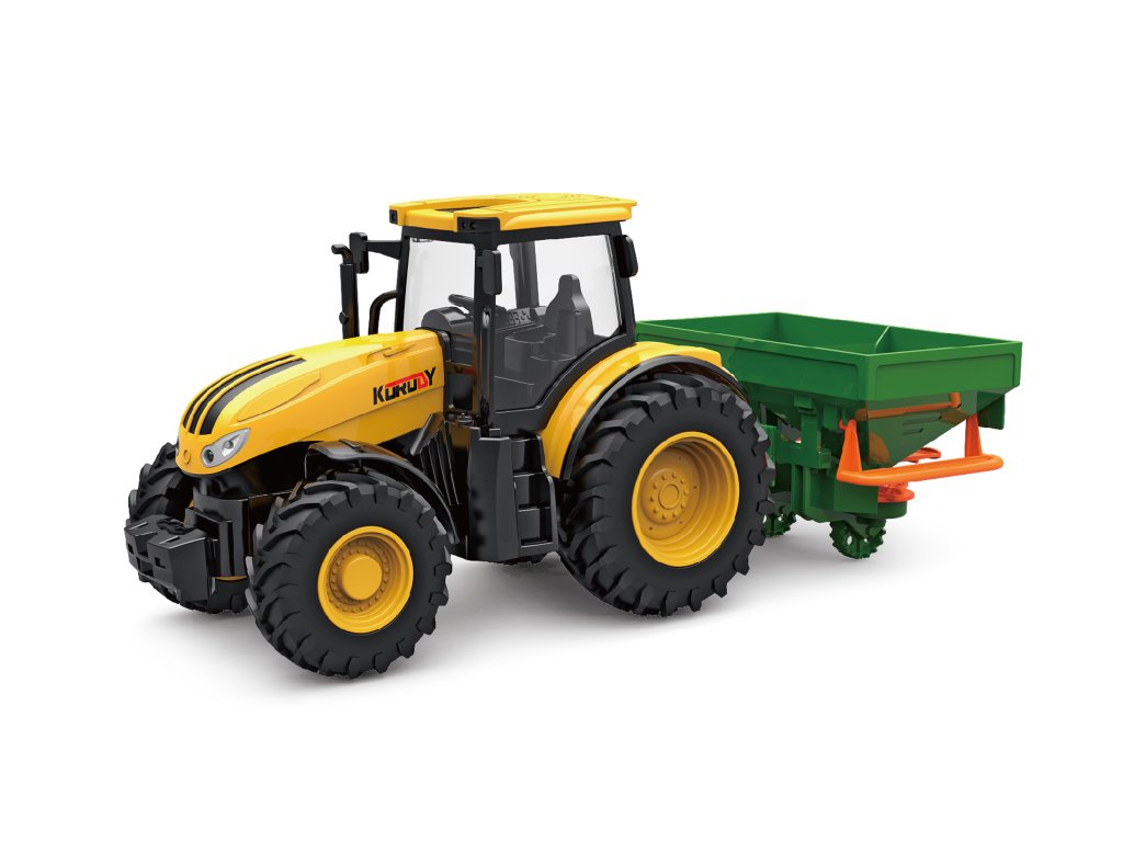 Traktor s příslušenstvím. Rozměry 27,5x11,5x12 cm. Na setrvačník. Světelné a zvukové efekty. 3xAG13 baterie součástí.
