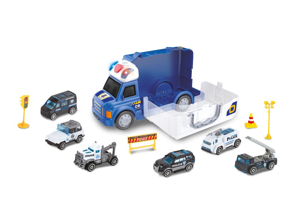 Auto policejní s efekty a 6 malými auty. Rozměry velkého auta 34x12,5x18,5 cm, velikost malých aut 7-8 cm. Volná kola. Světelné a zvukové efekty červeným tlačítkem na kabině. 2xAG13 baterie součástí. Obsahuje velké auto, 6 malých aut, semafor, fotobuňku, kužel, závoru.