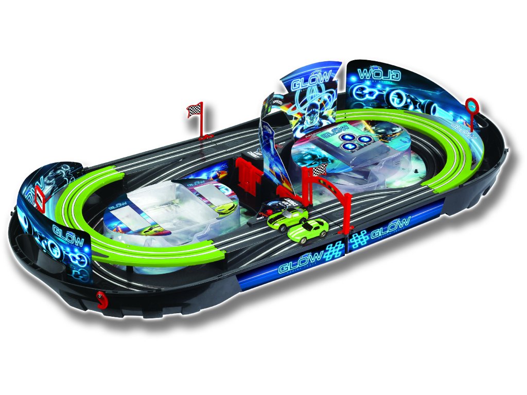 Autodráha rozkládací svítící. Rozměry 69x49,5x10,5 cm. 2 auta, 2 ovladače. 5xAA baterie nejsou součástí. Částečný obrázkový návod na použití na zadní straně obalu.