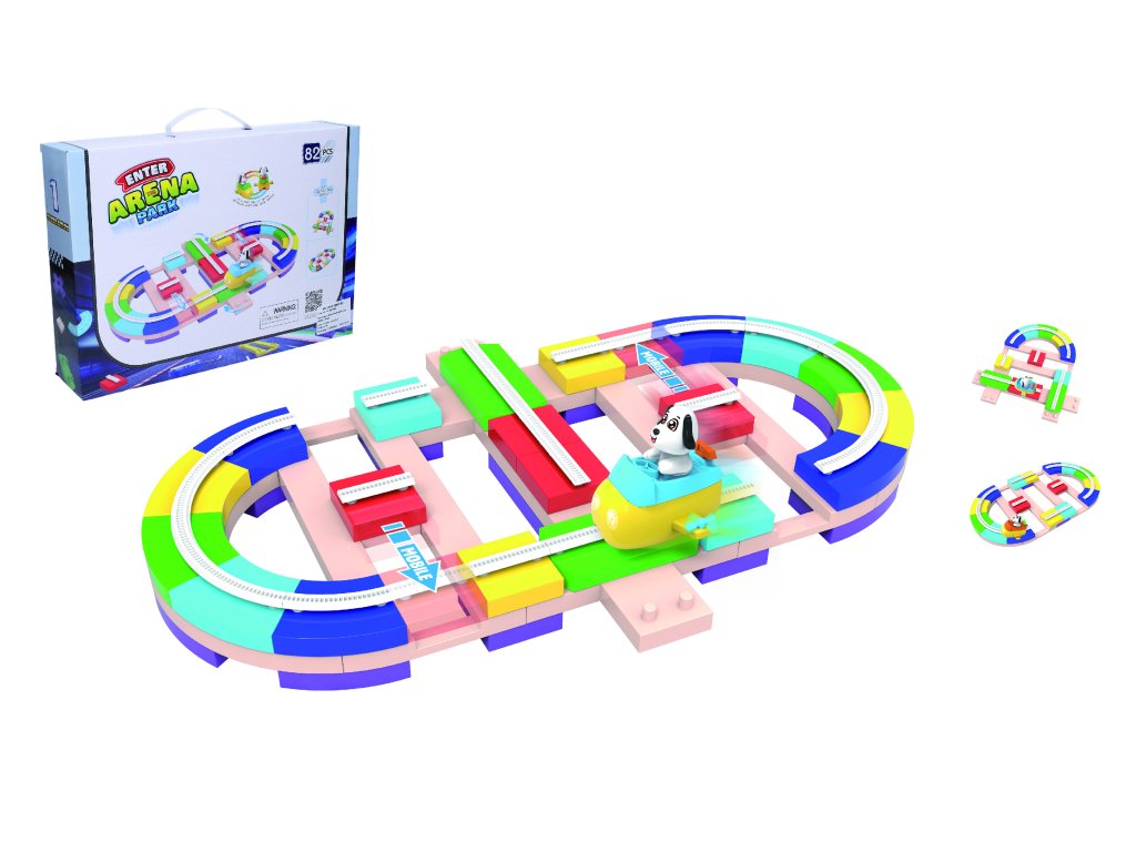 Autodráha stavebnice s vozíkem a figurkou pejska. Rozměry 59x36 cm, délka trati 118 cm. Obsahuje 82 dílků a obrázkový návod. Vozík má 2 rychlostní režimy, které se volí přepínačem v zadní části vozíku. Dráha má několik pohyblivých dílků. Manuální manipulací s těmito dílky je možné za chodu měnit dráhu jízdy. Vozík - 2xAAA baterie nejsou součástí. Pro lepší stabilitu je možné na spodní stranu dráhy umístit přísavky (balení obsahuje 10 ks).