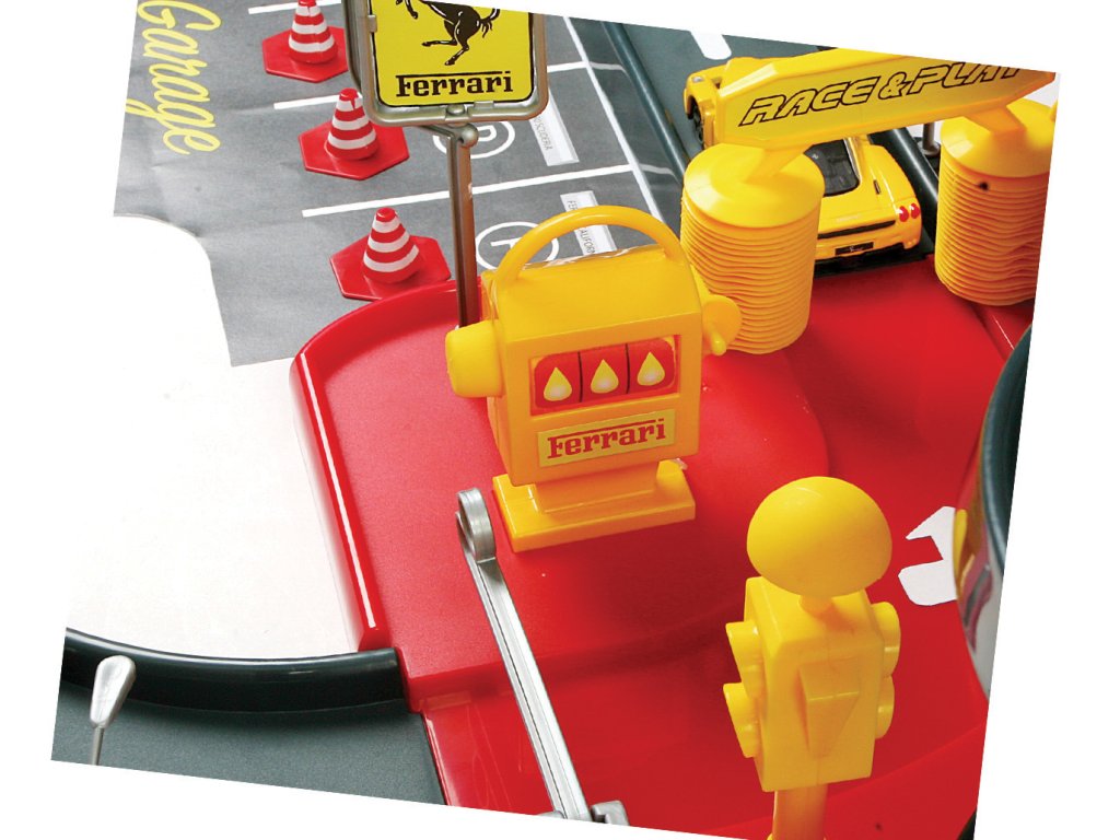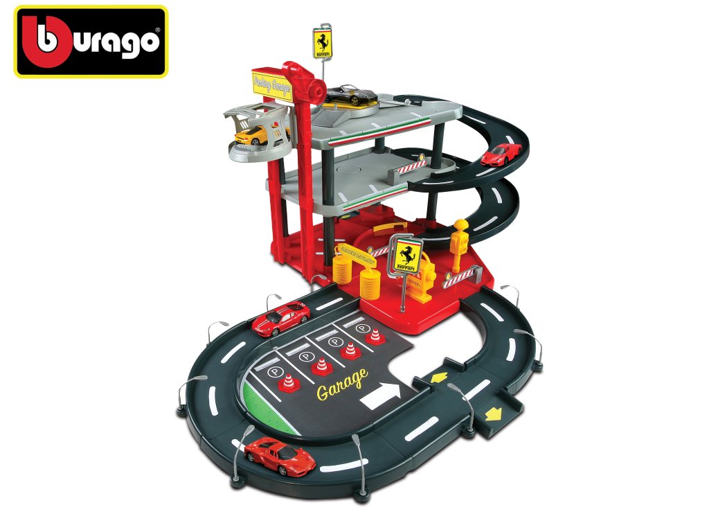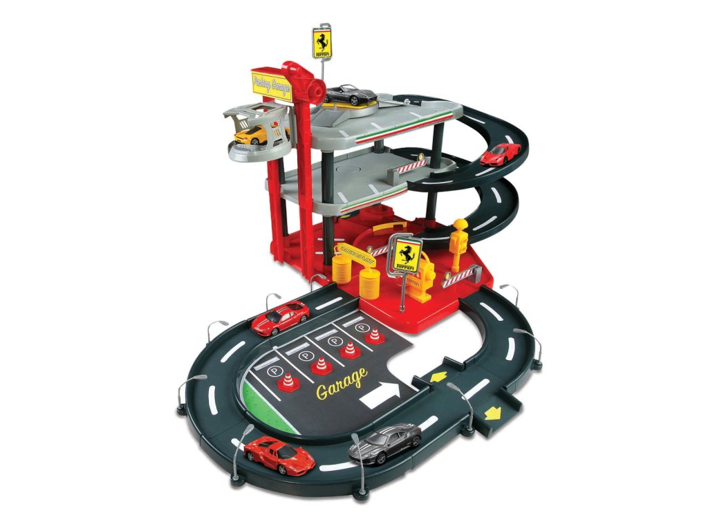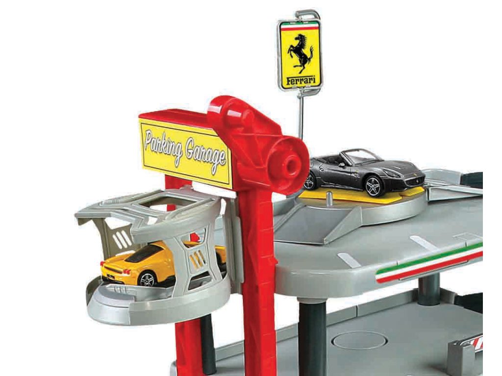 Třípatrová garáž Ferrari Kids s myčkou v sobě skrývá mnoho funkčních prvků! Vyvez autíčko výtahem až do nejvyššího patra garáže a spusť ho dolů po silnici! Natankuj, umyj auto v myččce a projeď zvedacími závorami!