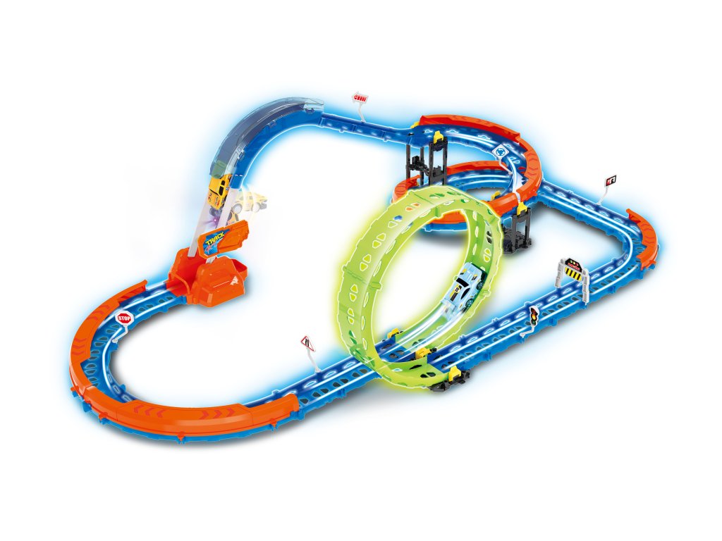 Dráha se svítícím autíčkem. Rozměry sestavené dráhy 88x27x48 cm. Auto - vestavěná 3,7V 90Mah Lithiová baterie, USB nabíjecí kabel je součástí balení. ON/OFF přepínač a nabíjecí port na spodní straně auta.