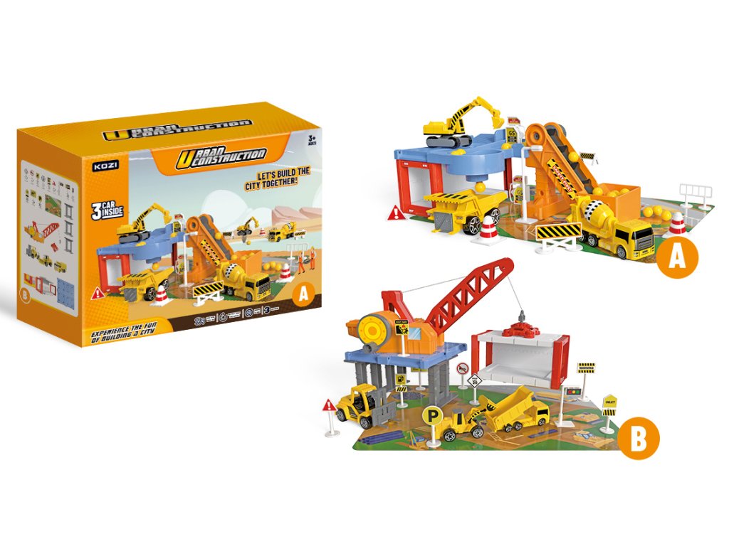 Garáž - stavební auta. Rozměry 26x19x11 cm. Obsahuje garáž, sklápěč, bagr, domíchávač, přepravní pás, značky.