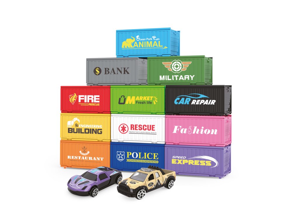 Kontejnerové město - 6 kontejnerů. Velikost kontejneru 12,5 cm, auta 7 cm. Obsahuje 6 kontejnerů, 6 kovových aut s volnými koly. Každý kontejner obsahuje 1 kovové auto, 2 budovy, 2 pouliční lampy, semafor, ulici, 2 figurky, polepy, obrázkový návod na sestavení.