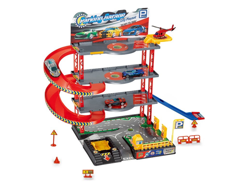Parkovací stanice se 3 kovovými auty a vrtulníkem. Rozměry 59x27x39 cm. Velikost auta 7 cm. Stanice obsahuje 3 kovová auta, 1 kovový vrtulník, heliport, čerpací stanici, závoru.