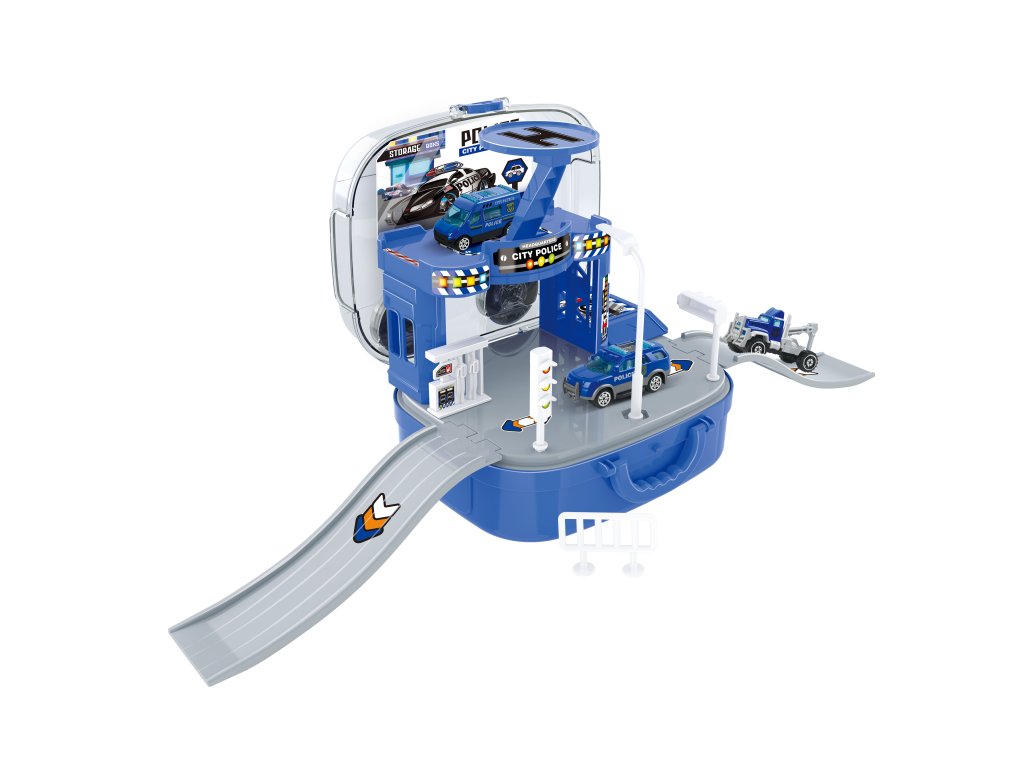 Policejní stanice v kufříku. Rozměry 44x17x19 cm, velikost auta 6 cm. Součástí 2 auta, 1 vrtulník. Manuální výtah.