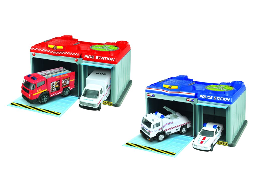 Stanice přenosná se 2 kovovými auty. Rozměry stanice 24x15,5x12,5 cm, velikost aut 13 cm. Materiál aut kov/plast. 2 varianty - záchranná, úklidová.