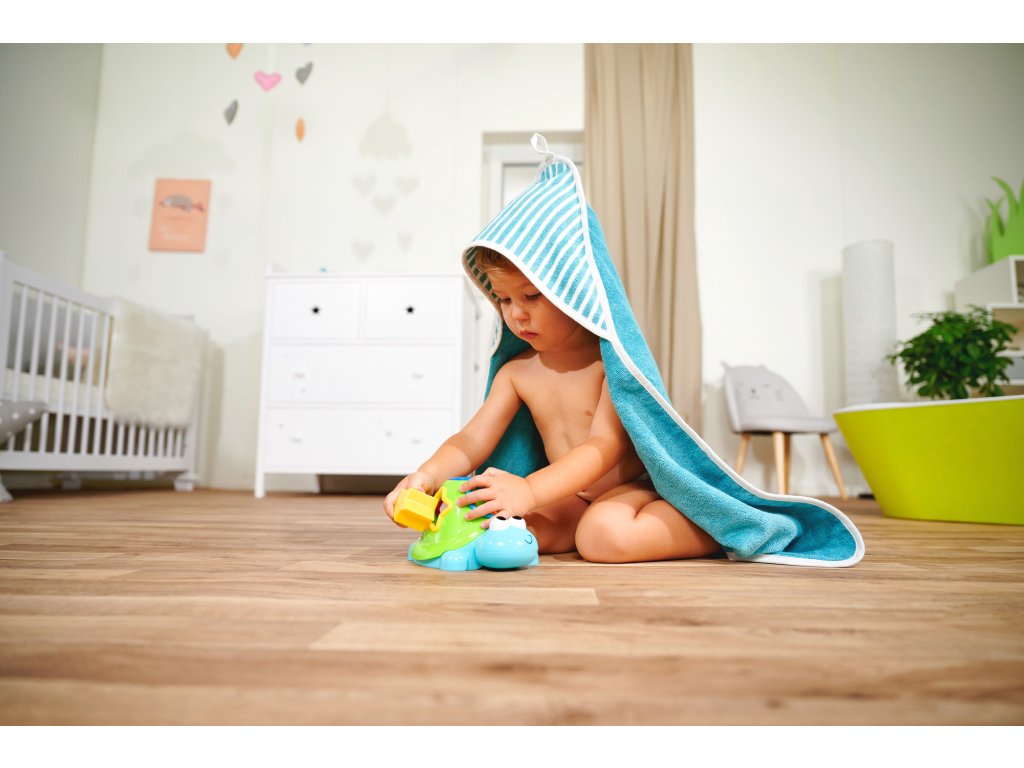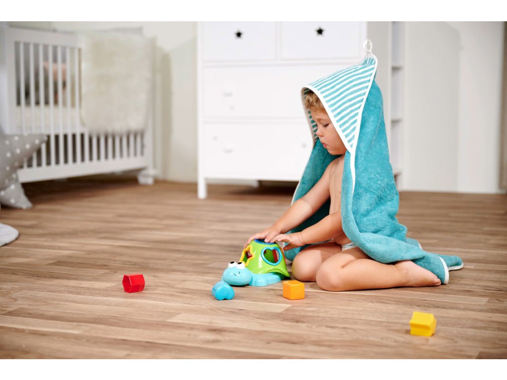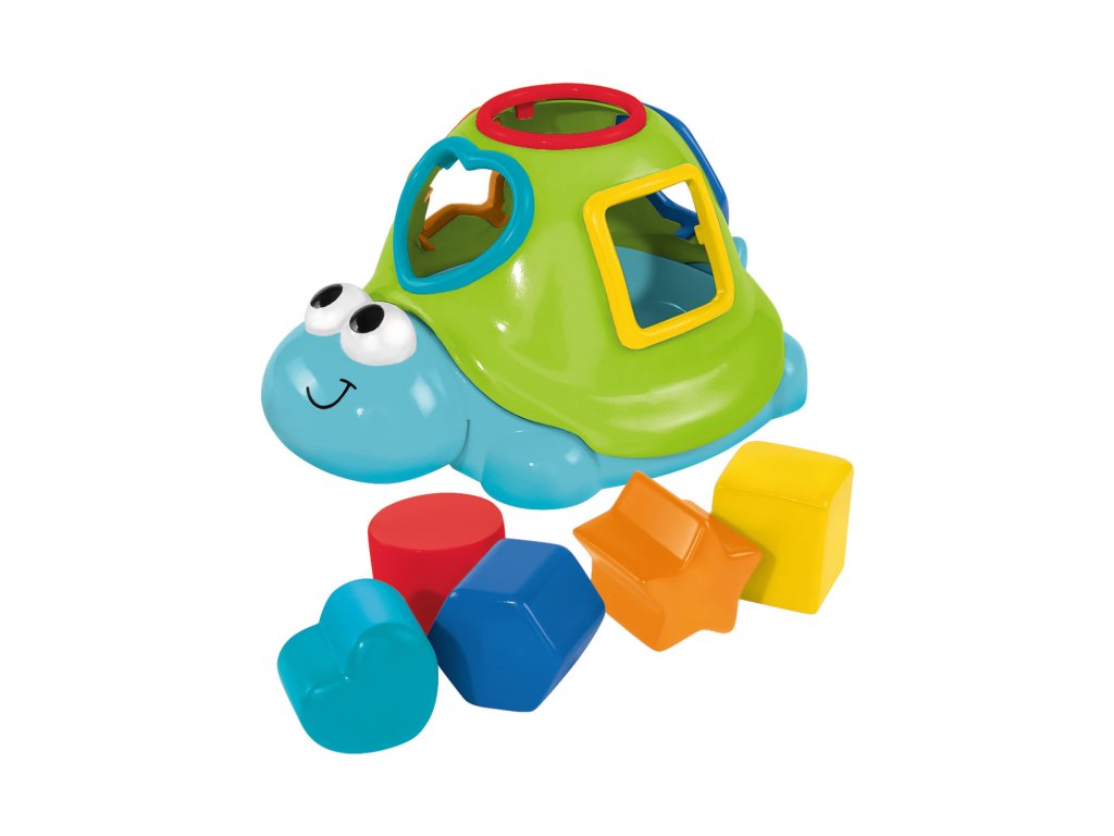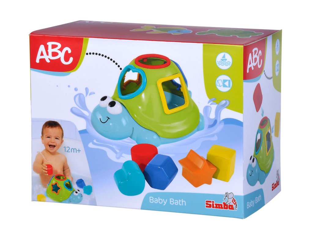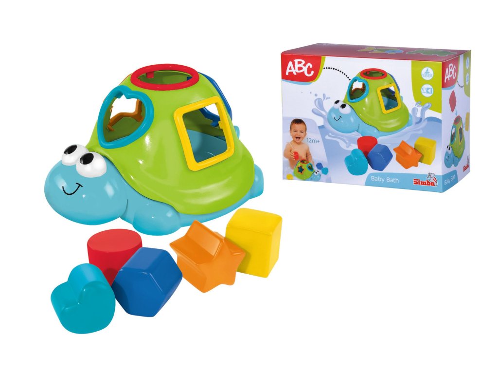 Vkládačka ve tvaru želvy ve vodě plave na hladině, součástí 5 kostiček různých tvarů. Délka želvičky 20 cm.