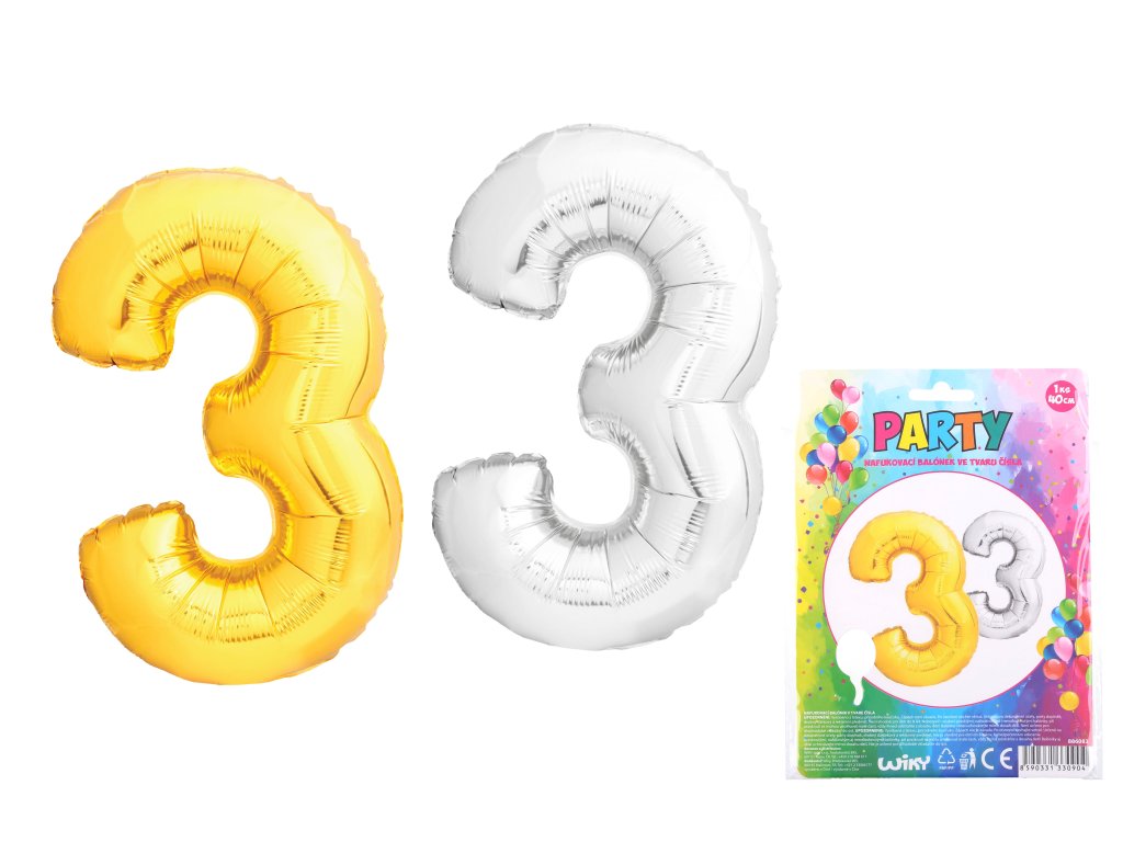 Balónek číslo 3 - 40 cm. Barevné varianty - zlatá, stříbrná Materiál - nylon.