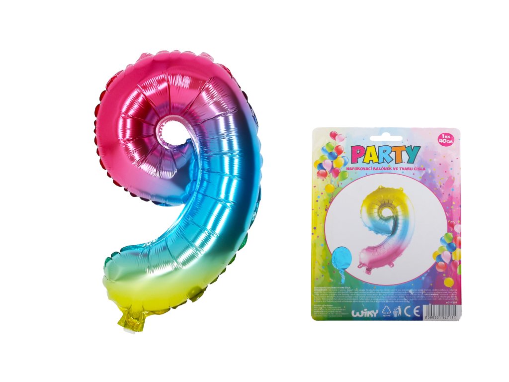 Duhový nafukovací balónek ve tvaru čísla 9 je vhodný jako doplněk na narozeninovou párty!