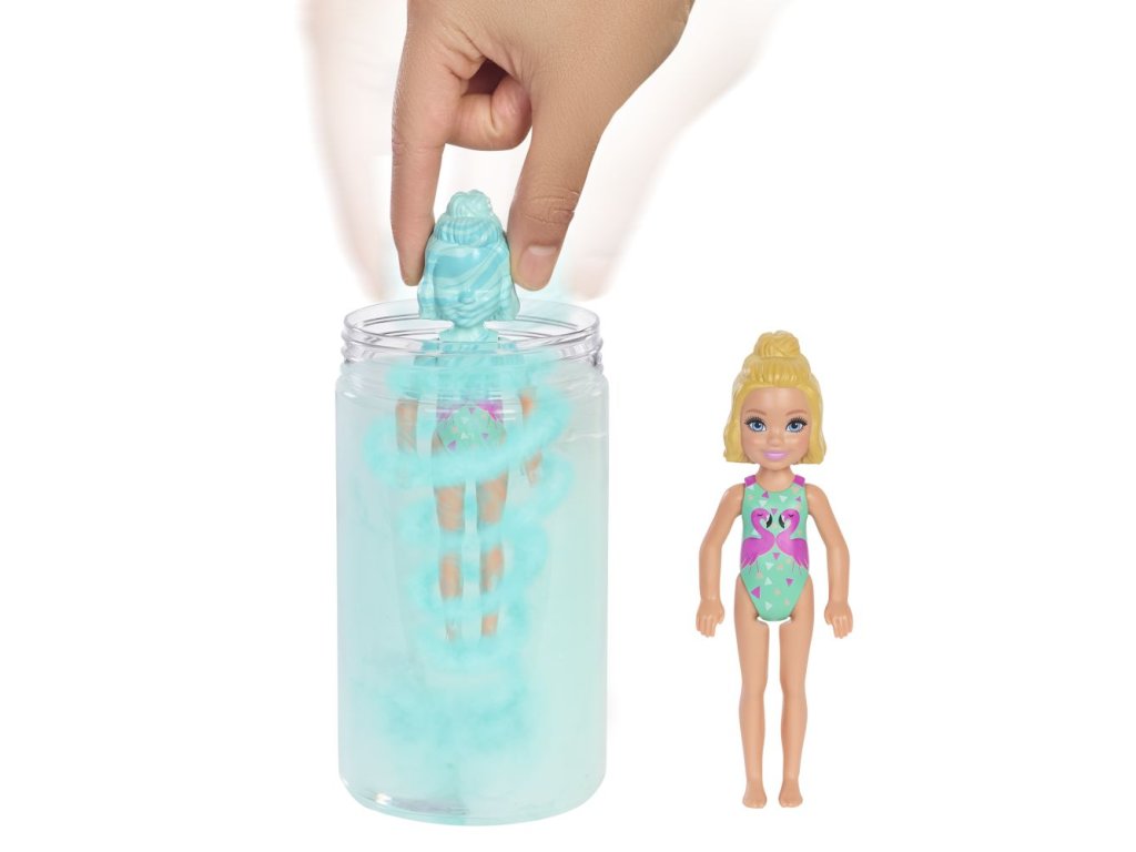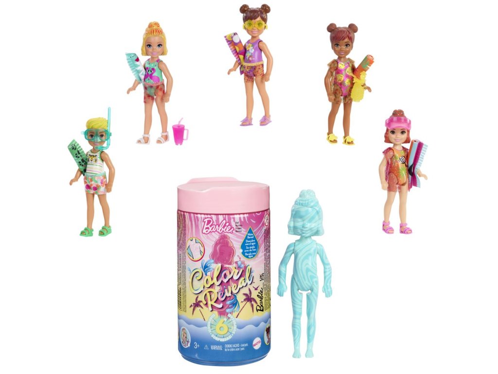 Panenky Barbie® Chelsea ™ Color Reveal ™ přinášejí překvapení při rozbalování! Panenka s trendy módou je zaručena, ale vzhled každé panenky zůstává záhadou, dokud není odhalen. Balení je součástí zábavy - zatažením za proužek odstraníte vnější vrstvu a odhalíte průhlednou tubu. Uvnitř je tajemná mramorová fialová panenka Chelsea ™ Color Reveal ™ a šest dalších překvapení. Všechny je vyjměte a naplňte tubu teplou vodou, poté vložte panenku a zatočte s ní. Voda se změní na pastelově fialovou a po vytažení panenky se odhalí její vzhled! Každá panenka má jinou kombinaci barevných vlasů, tónu pleti a zdobených plavek, ale překvapení pokračují...otevřete další sáčky a naleznete zakrytí nebo sarong, boty, ručník a plážový doplněk. Pomocí ledově studené vody proměňte vlasy a živůtek panenky. S použitím teplé a ledově studené vody mohou děti opakovat tento úžasný okamžik znovu a znovu! Prázdnou tubu využijte na uložení panenčiných doplňků nebo jiných hraček. Jakou panenku odhalíte? Každá panenka se prodává samostatně, v závislosti na dostupnosti. Panenka nemůže stát sama. Barvy a dekorace se mohou lišit.