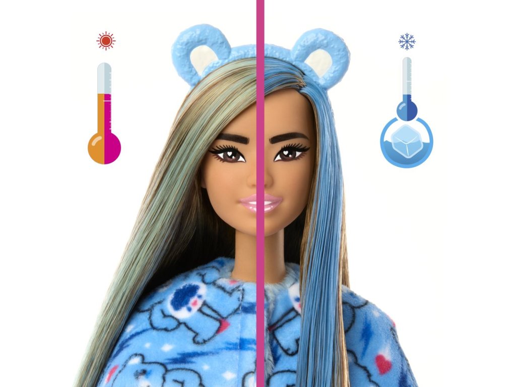 Panenky Barbie® Cutie Reveal™ Starostliví medvídci přinášejí ten nejroztomilejší zážitek z rozbalování s 10 překvapeními! Objevte jednu ze tří různých postaviček - veselého medvídka, rozverného medvídka nebo mrzutého medvídka. Sundejte rozkošný plyšový kostým a odhalte polohovatelnou panenku Barbie®. Kterou panenku odhalíte? Najděte také další překvapení, například sukni, čelenku, sluneční brýle, boty, houbičkový hřeben a medvídka! Použijte vodu pro opakovanou proměnu barvy vlasů panenky! Panenky se prodávají samostatně dle aktuální nabídky.