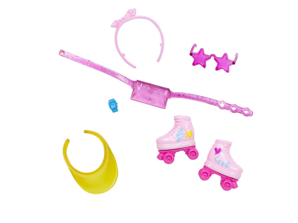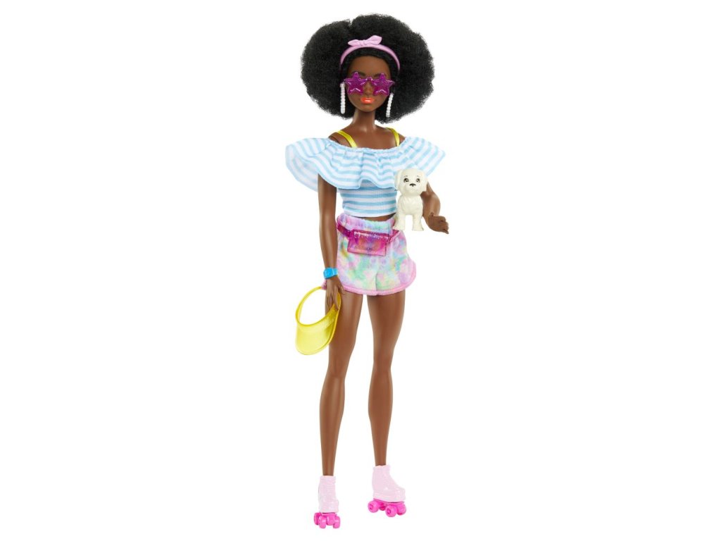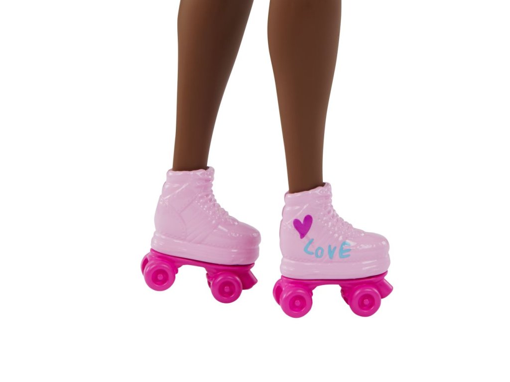 Se svěžím vzhledem, stylovými doplňky a štěněcím kamarádem po boku je tato Barbie® Deluxe módní panenka - trendy bruslařka připravena na nejrůznější dobrodružství! Panenka Barbie® má na sobě volánkovou halenku a sportovní pastelové šortky. Má kudrnaté černé afro vlasy a na nohou obuté rozkošné růžové kolečkové brusle! Barevné doplňky umocňují její módní outfit: čelenka s mašlí, žlutý kšilt, hodinky a fialová taška s páskem. Na všech jejích výletech se k panence Barbie® přidává roztomilé štěňátko! Je oblečená pro nespočet aktivit - od zmrzliny s kamarádkami na promenádě až po bruslení s pejskem v parku. Panenka neumí samostatně stát. Barvy a vzhled výrobku se mohou lišit.