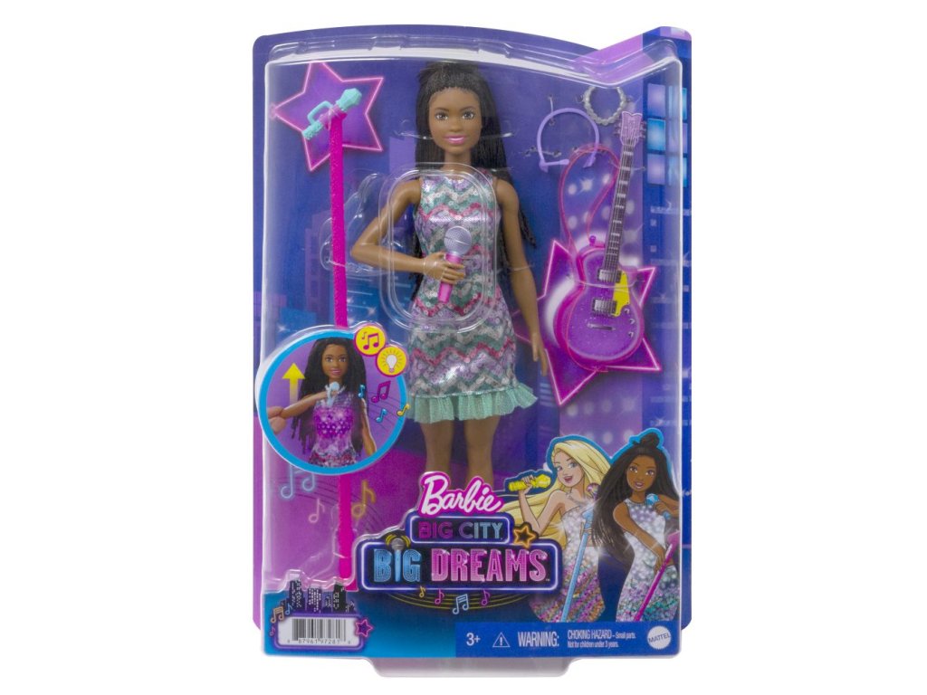 Prožijte ohromující okamžiky na pódiu s panenkou Barbie® "Brooklyn" Roberts v jejím charakteristickém vzhledu z filmu Barbie - Velké město, velké sny! Jste připraveni na záři reflektorů? Když děti zvednou mikrofon panenky Barbie® k ústům, její šaty se rozsvítí a zazní jedna ze dvou originálních písní z filmu! Děti mohou do své sbírky přidat panenku Barbie® "Malibu" Roberts (prodává se samostatně), aby doplnily rockový duet a představily si svá vlastní velká dobrodružství! Panenka neumí samostatně stát. Barvy a vzhled výrobku se mohou lišit.