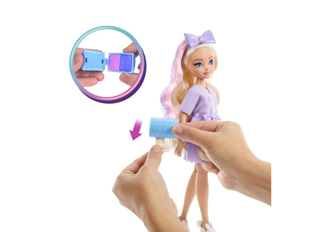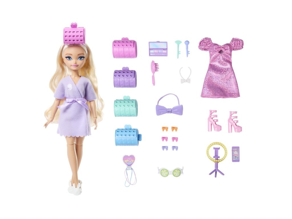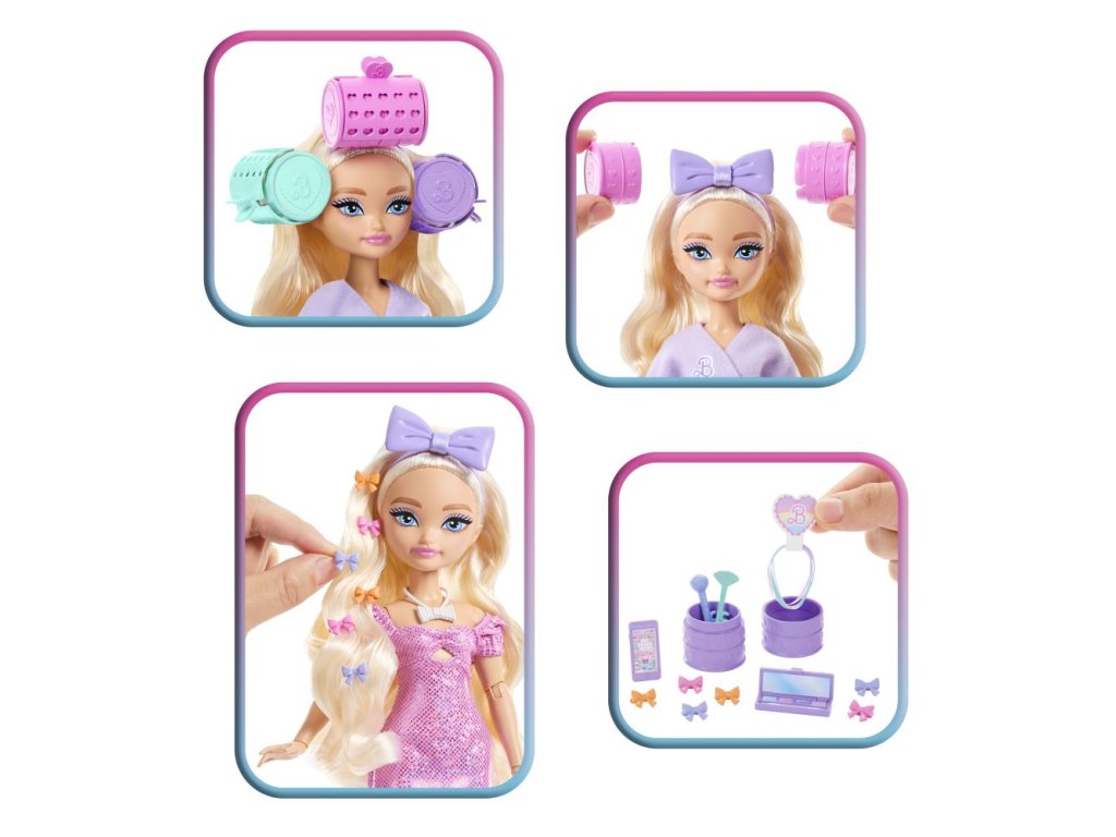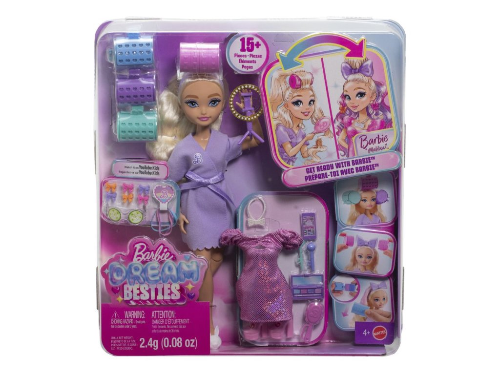 Připravte se na den plný módy, účesů a zábavy s panenkou Barbie „Malibu“! Panenka má dlouhé vlasy pro kreativní styling a spoustu doplňků, které se skrývají v natáčkách na vlasy – objevíte třeba sponky, oční stíny nebo ozdoby. Nechybí župan, okurková maska, boty na podpatku a večerní šaty pro finální look. Barbie můžete upravit od hlavy až k patě – s pomocí paletky i kartáčku! Ideální pro děti od 4 let, které milují módu, účesy a hru na proměny.
