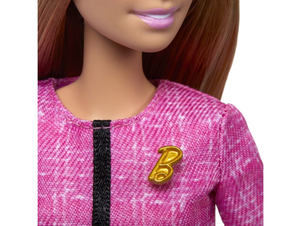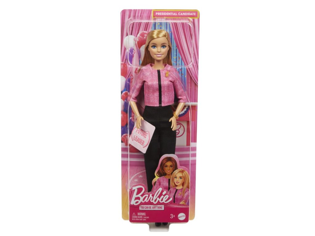 S panenkou Barbie® Lídryně budoucnosti si mohou děti vyzkoušet všechny druhy vedoucích pozic až po ty nejvyšší! Panenka Barbie® je připravena inspirovat děti k příběhům o vůdčích osobnostech, a to od příběhů z volebních kampaní až po momenty spojené se samotným rozhodováním. Panenka má na sobě elegantní růžovo-černý obleček doplněný dvěma zlatými náramky a odznakem s písmenem "B".