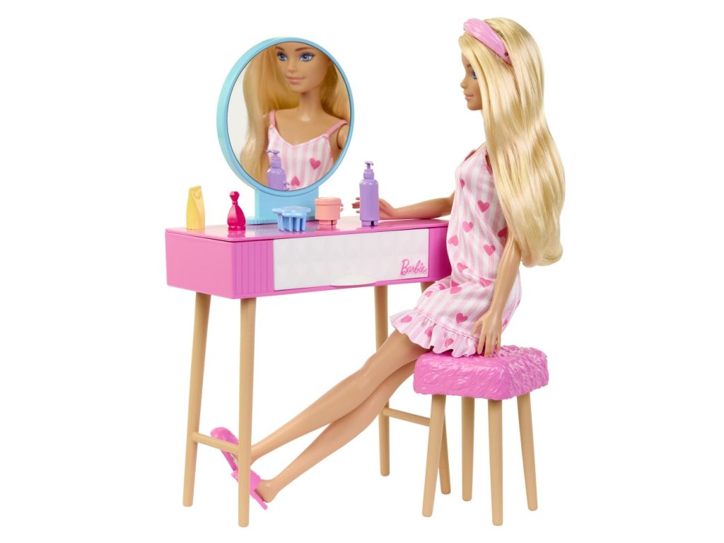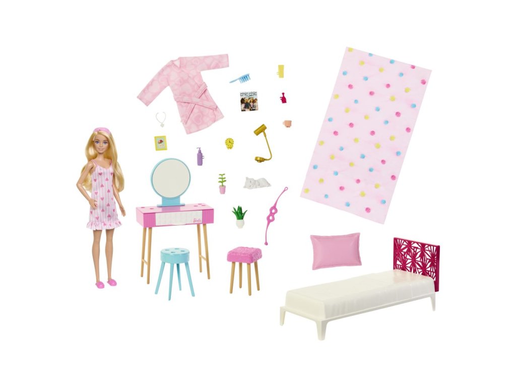 Tento herní set Barbie® Ložnice s panenkou bude inspirací pro milé ranní i večerní příběhy! Panenka Barbie® je dodávána s ospalým koťátkem a více než 15 tematickými doplňky do ložnice. Barbie® se pohodlně uvelebí v rozkošném pyžamovém kompletu s potiskem a nazuje si bačkůrky. Její huňatý růžový župan je extra hebký! Nábytek, jako je postel, noční stolek a toaletní stolek, vytváří scénu pro nejrůznější možnosti hraní rolí, ať už jde o přípravu na den nebo večerní ukládání k spánku s horkým kakaem a časopisem. Doplňky pro panenku Barbie® zahrnují stylingové prvky, jako jsou čelenka a maska na spaní, nebo dekorační předměty, jako jsou lampa a rostlina! Panenka neumí samostatně stát. Barvy a vzhled výrobku se mohou lišit.