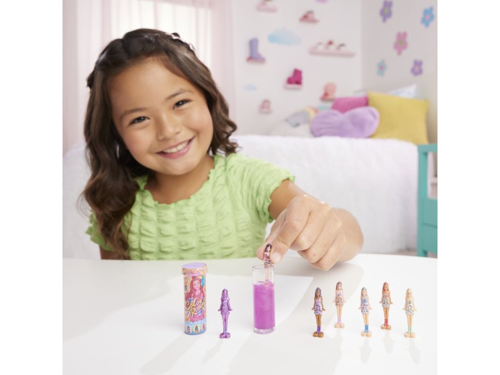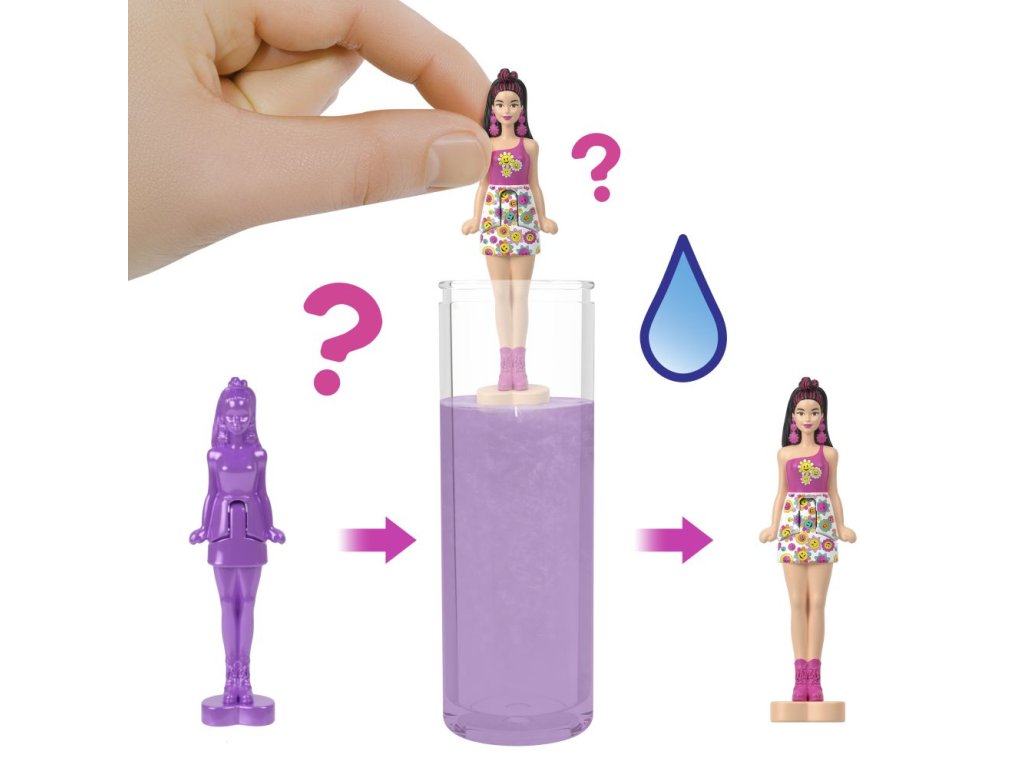 Vstupte do světa panenky Barbie® s Mini BarbieLandem - místem, kde si můžete i s malou hračkou představovat velké věci! S panenkami Mini BarbieLand Color Reveal vás čeká velká zábava i překvapení při rozbalování. Otevřete malou tubu, vytáhněte mini panenku pokrytou speciální barevnou vrstvou a použijte vodu podle návodu, abyste odhalili vzhled panenky - je to tak jednoduché! Kterou panenku odhalíte? Každá 4 cm velká panenka se ohýbá v pase a stojí na podstavci ve tvaru srdce.