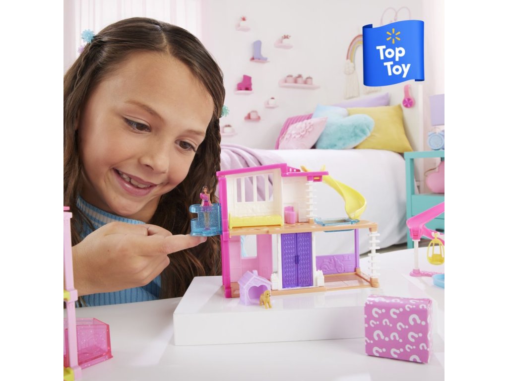 Vítejte v Mini BarbieLandu, kde jsou domy pro panenky malé, ale nabízejí velkou porci zábavy jako jsou skluzavky, bazén, výtah a nábytek. Otevřete malou krabici ke stěhování a odhalte příslušenství k domečku, pejska a téměř 4 cm velkou kloubovou panenku Barbie®.