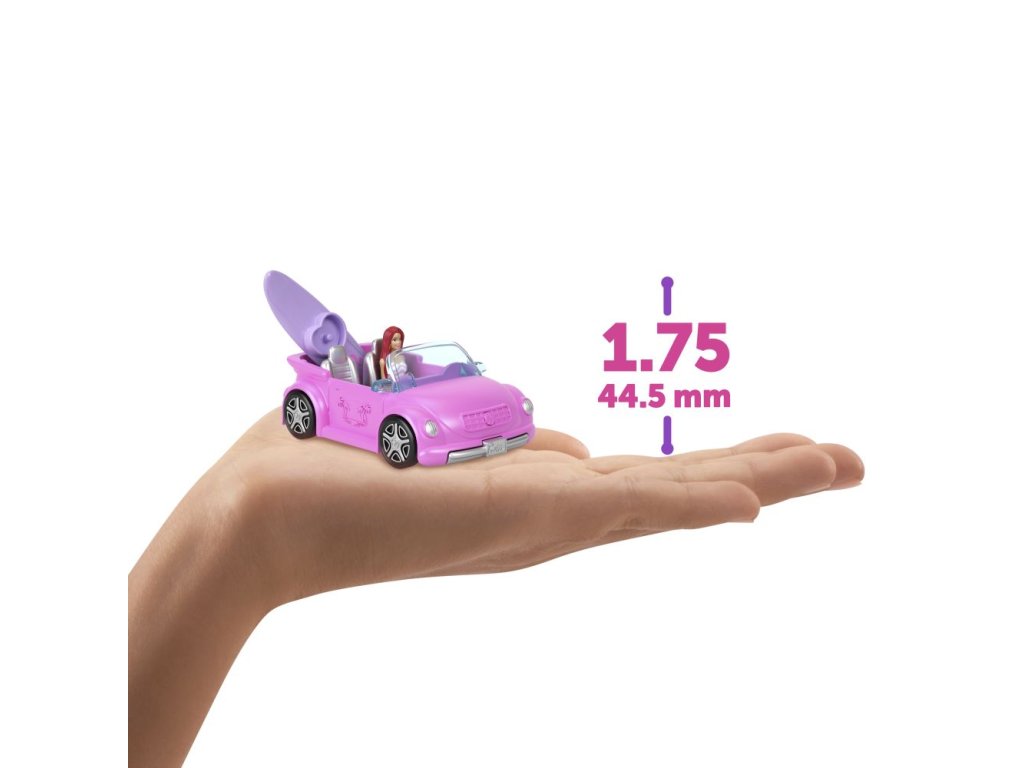 Vstupte do světa panenky Barbie® s Mini BarbieLandem - místem, kde si můžete i s malou hračkou představovat velké věci! Tyto sety mini vozidel jsou připraveny ke hře nebo vystavení. Tato zmenšená verze plážového kabrioletu Barbie obsahuje surfovací prkno s možností změny barev a příslušenství pro scénu s vlnami a palmou. Sada se dodává s rozkošnou téměř 4 cm velkou panenkou Barbie, která se ohýbá v pase, takže může sedět a jet vstříc velkým dobrodružstvím v Mini BarbieLandu.