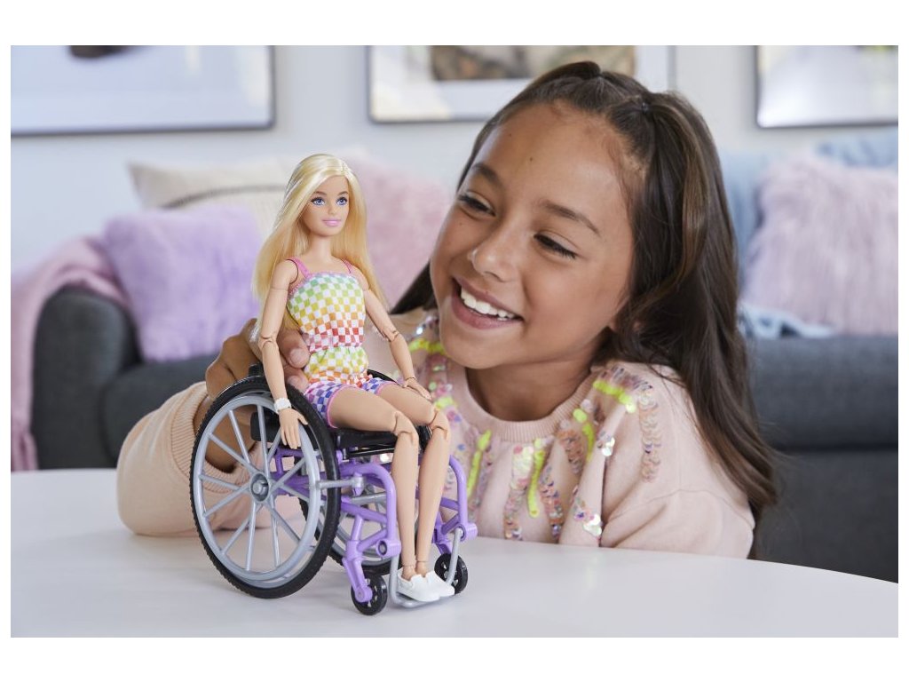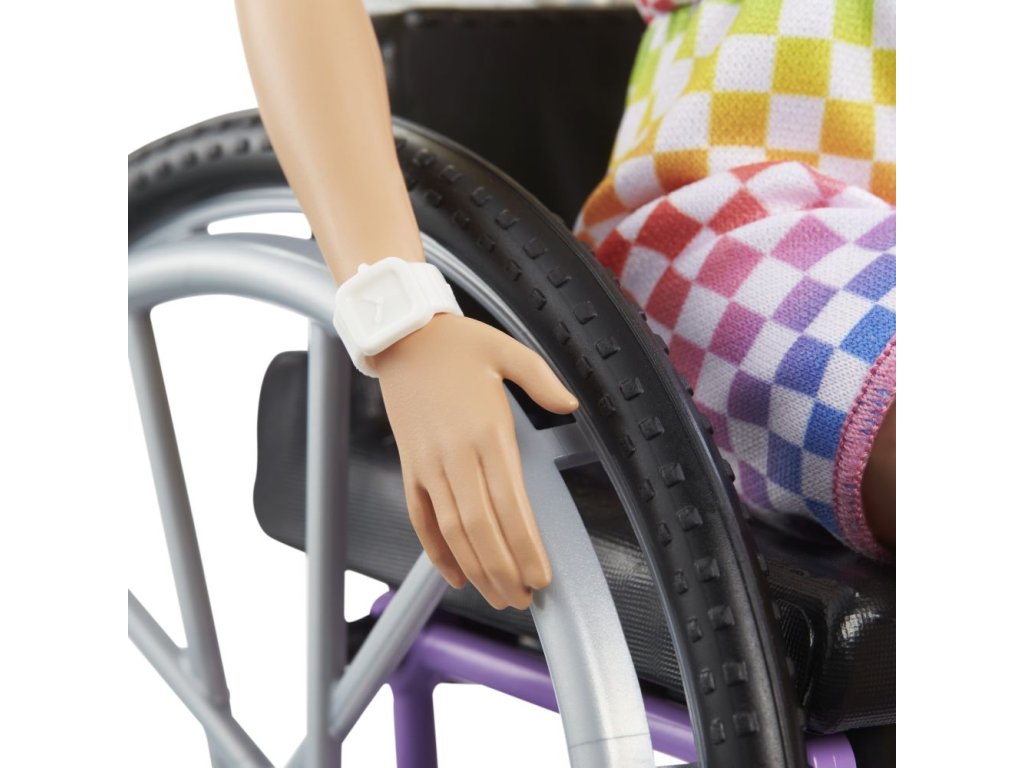 Barbie® Modelka na invalidním vozíku je součástí kolekce oslavující rozmanitost! Obsahuje panenku Barbie®, která sedí na manuálním fialovém invalidním vozíku, je oblečená do duhově kostkovaného overalu, má 22 kloubů pro různé možnosti pózování a hraní, a u sebe růžovou nájezdovou rampu. Panenka neumí samostatně stát.