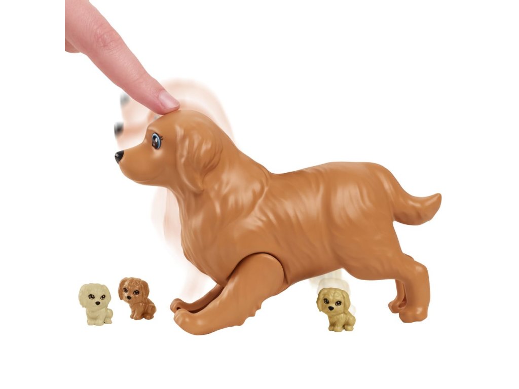 Herní set Barbie® Novorozená štěňátka umožňuje fantazii prozkoumat péči o domácí mazlíčky! Tento herní set obsahuje fenku, která je připravena porodit tři rozkošná štěňátka. Po příchodu na svět mohou děti všechna tři štěňátka umístit do nositelného pelíšku panenky Barbie® a pečovat o ně i na cestách. Použijte studenou vodu a užijte si překvapení v podobě speciálního mateřského znaménka na každém štěněti, poté použijte teplou vodu, abyste znaménko skryli a opakujte. Panenka Barbie® má růžové kostkované šaty a ležérní boty. Doplňky zahrnují kartáče, psí pamlsky, ošetřovací pomůcky a další.