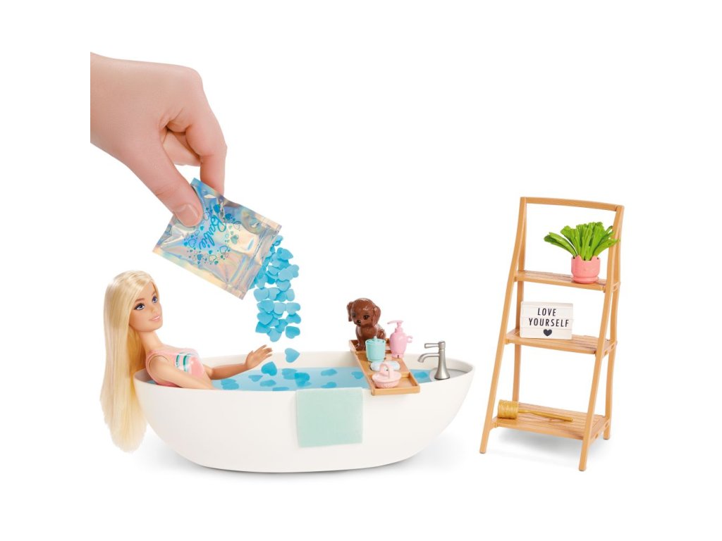 Tento herní set Barbie® Panenka a koupel s mýdlovými konfetami s vanou a panenkou Barbie® obsahuje Barbie® panenku oblečenou do plavek s roztomilým sarongem, která je polohovatelná a dodává se se spoustou doplňků jako jsou vana a podnos, ručník, kartáče, štěňátko a další. Součástí balení jsou dva sáčky konfetového mýdla (růžové a modré), které změní barvu vody ve vaně! Panenka neumí samostatně stát.
